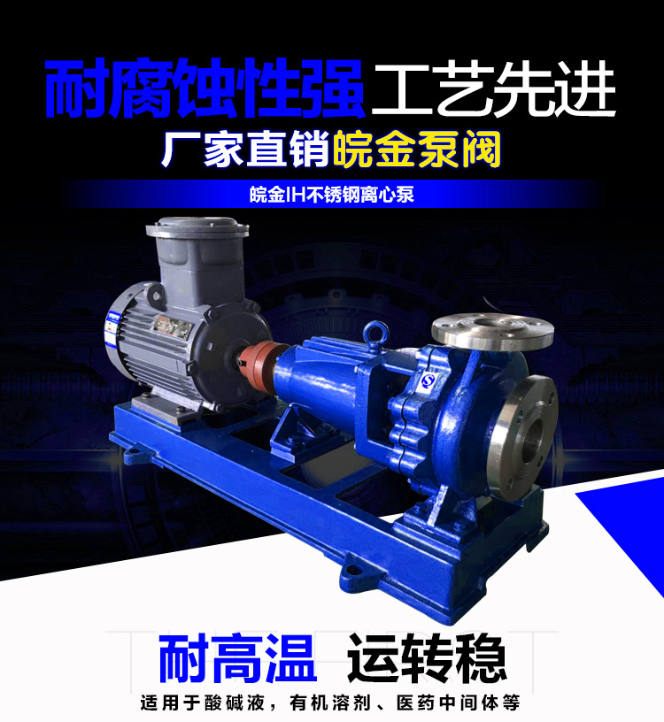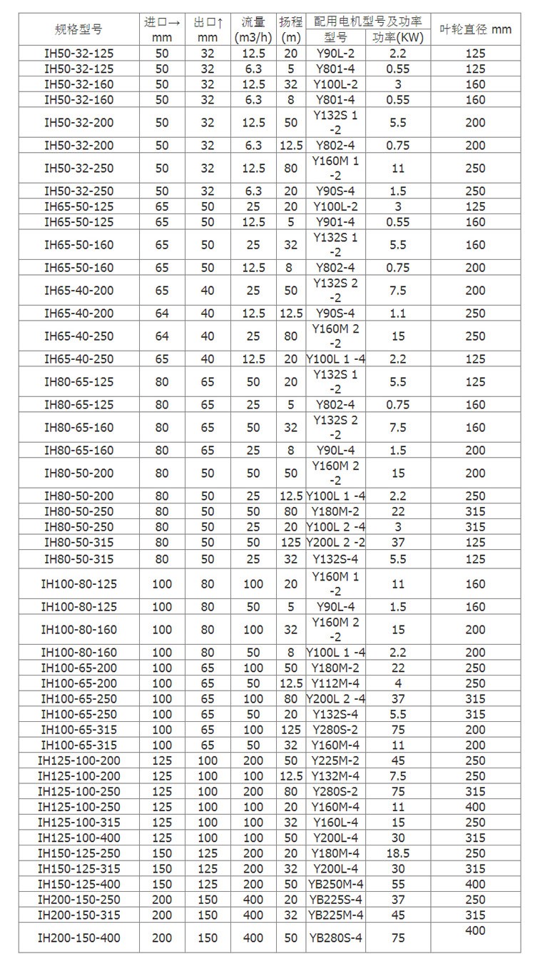 IH型化工泵是單級單吸懸臂式離心泵,其標記額定性能點和尺寸等效采用國際標準ISO2858-1975(E),是一種用以取代F型耐腐蝕泵更新換代的節能產品,適用于化工、石油、冶金、電站、食品、制藥、合成纖維等部門輸送溫度在-20℃~105℃的腐蝕性介質或物理、化學性能類似于水的介質。
